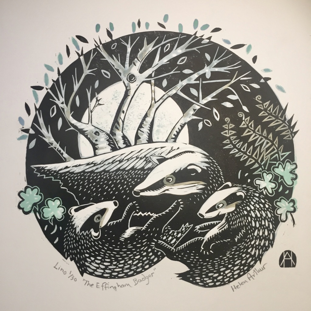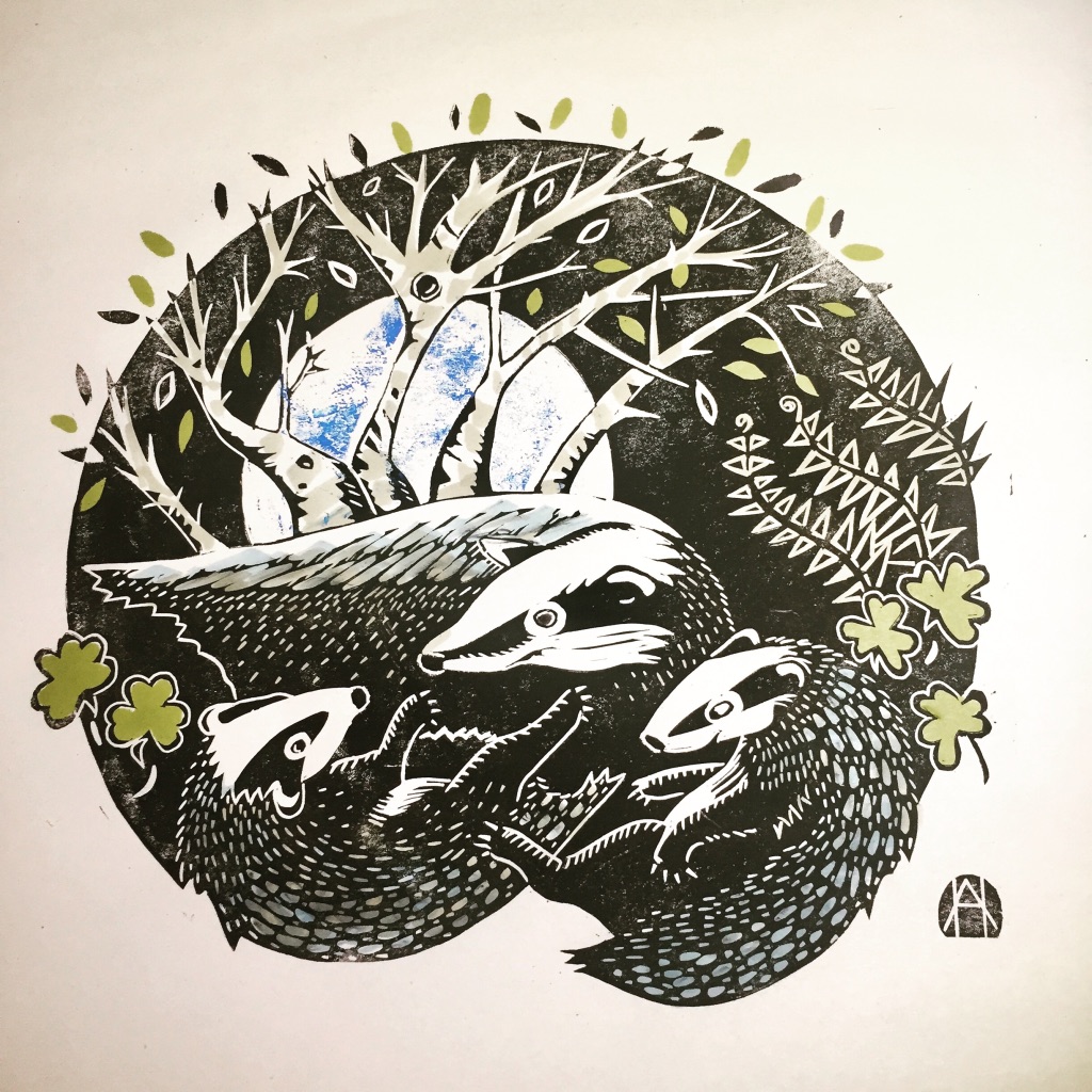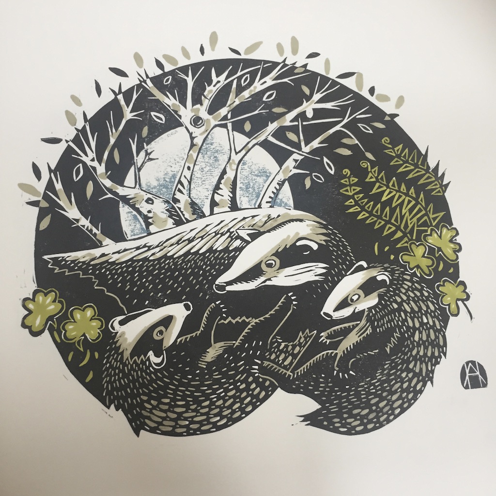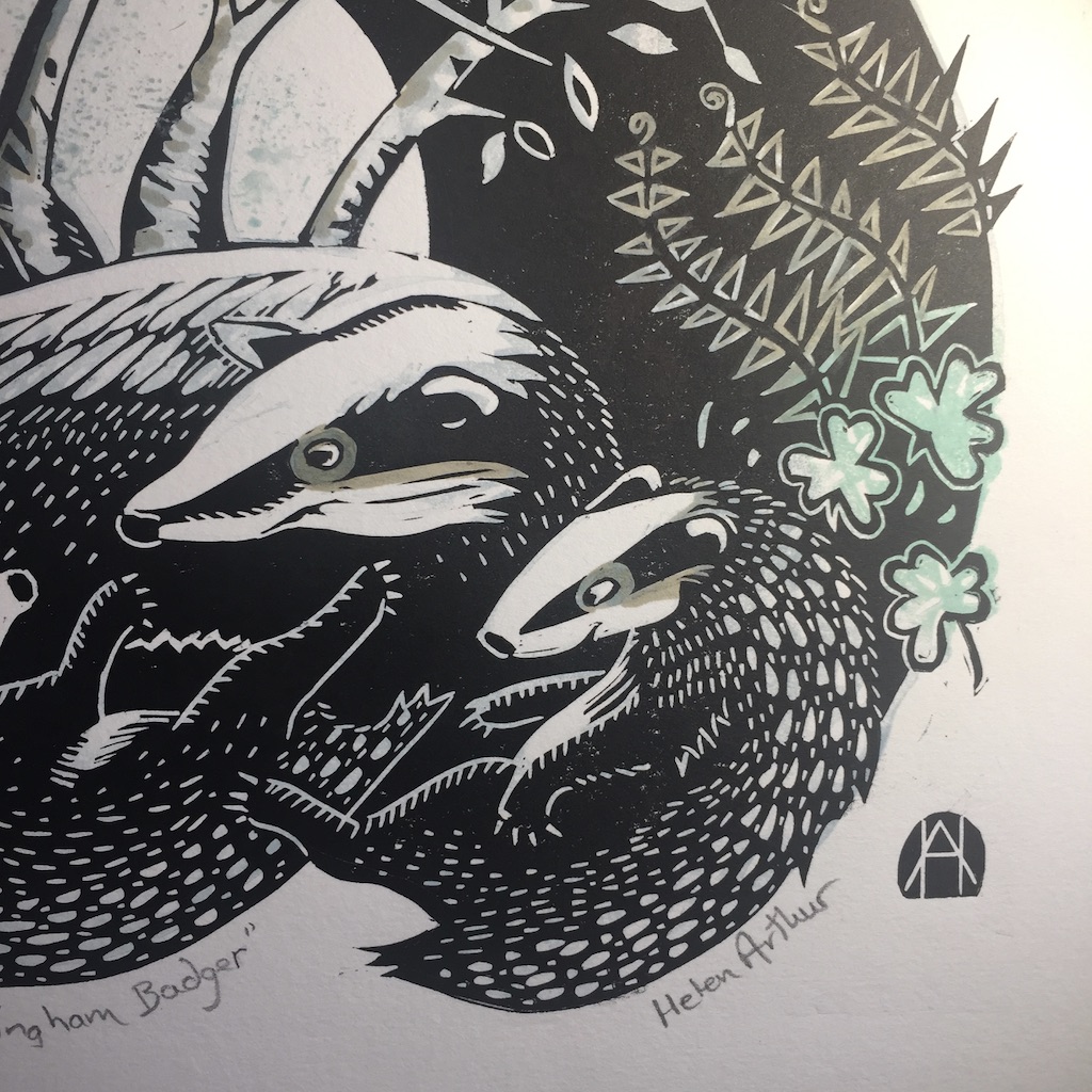 I was very happy to accept a commission for this artwork despite the rather pressing deadline of about 20 days. My brief was to create a linocut print featuring the badger and the Girl Guides trefoil. As a lover of British wildlife, particularly mammals, this was right up my street. I decided to create a 2-plate print – which is difficult to line up (register) onto each piece of paper, but gives flexibility in choosing different colour ways. I have so far created 2 prints – with mint green and grey foliage or moss-green and grey. The pictures below show the process in reverse from final print to conception. If you ever have any queries about process, do get in touch.