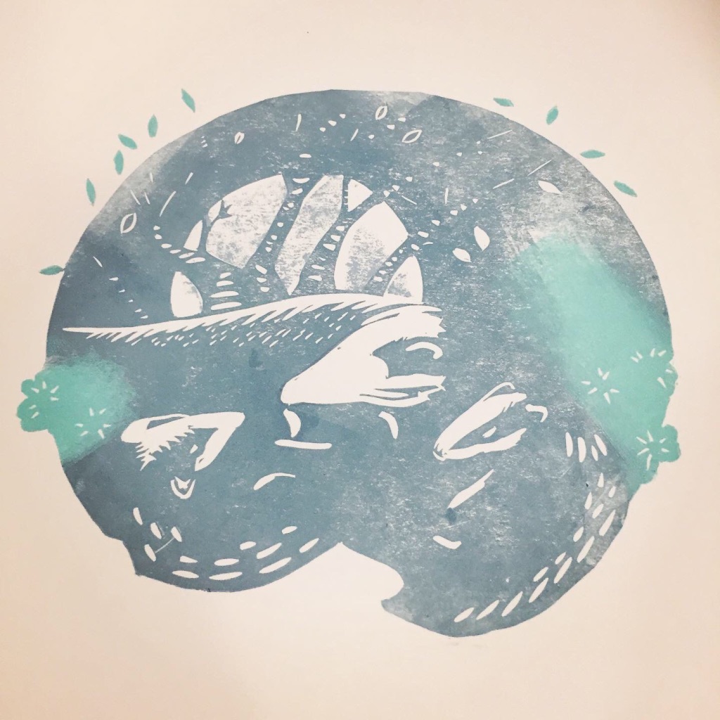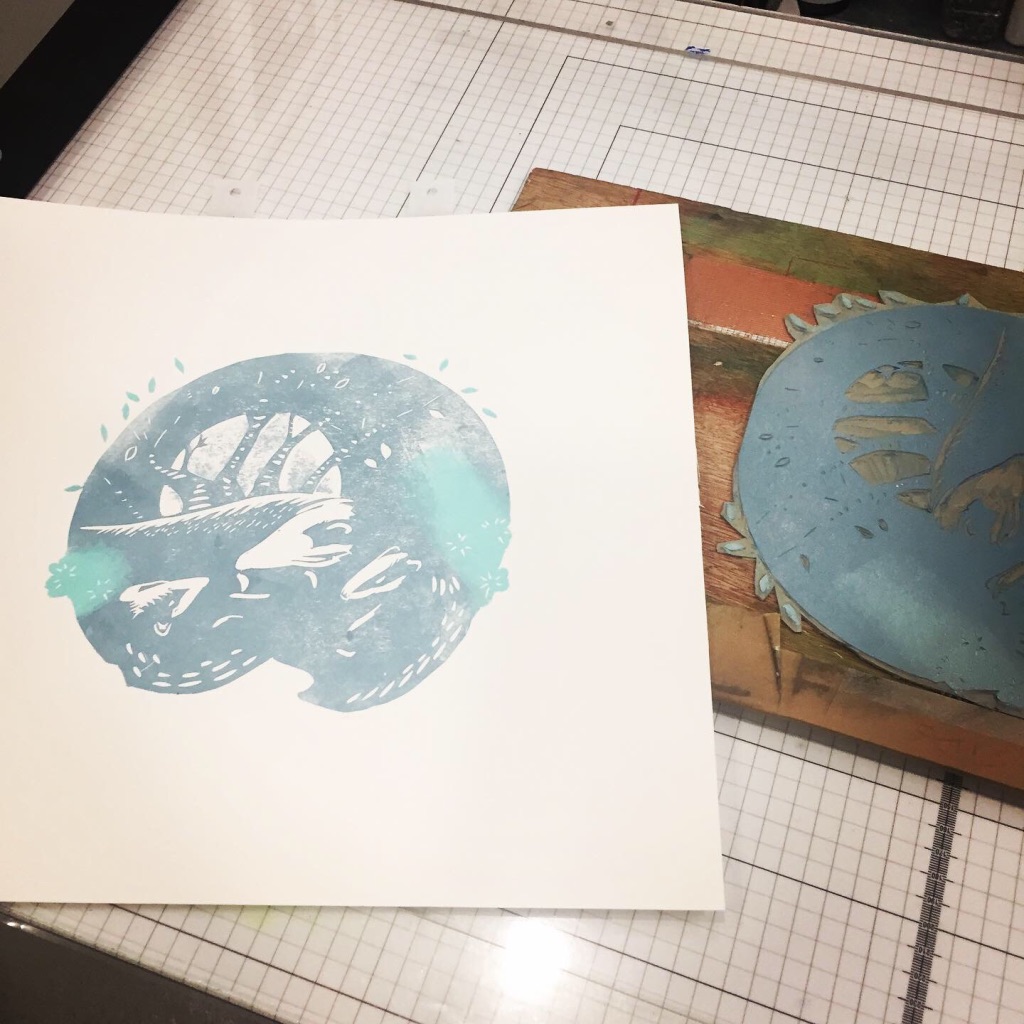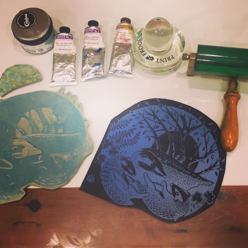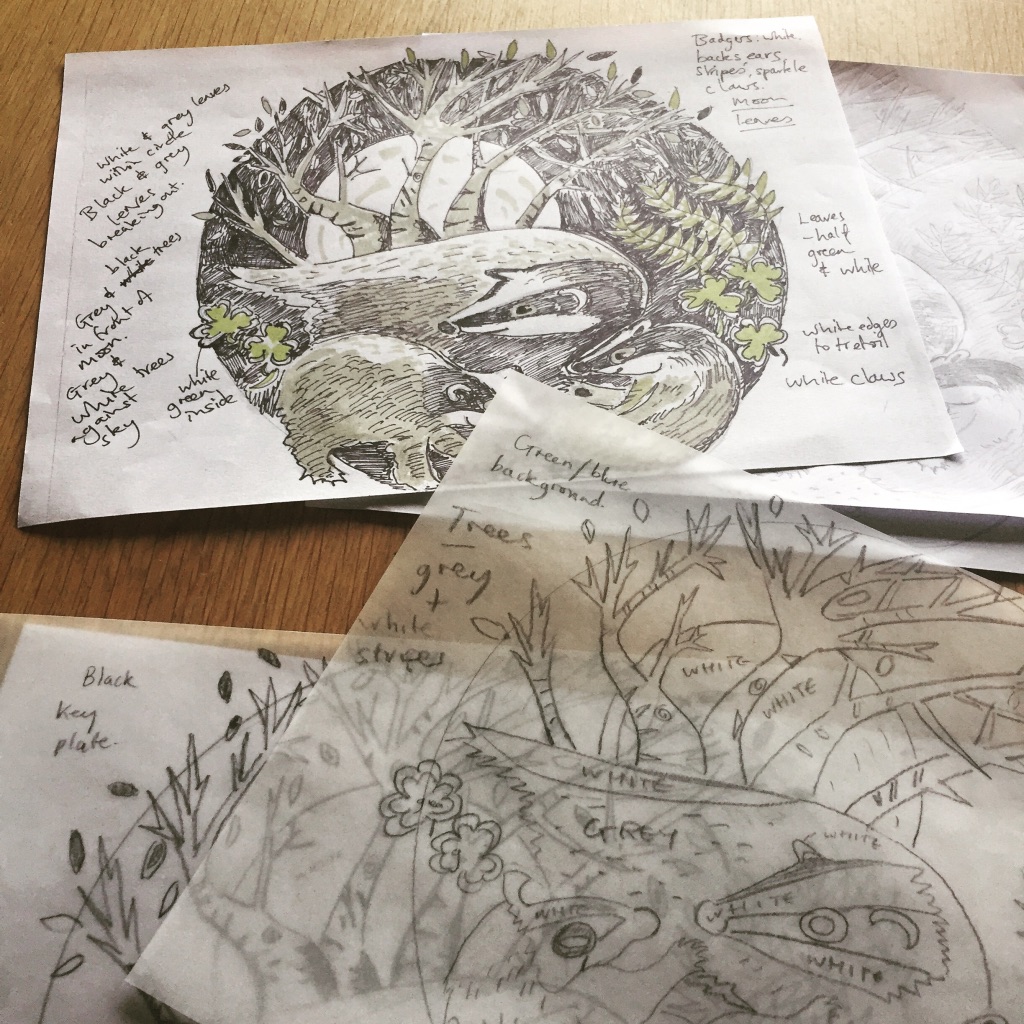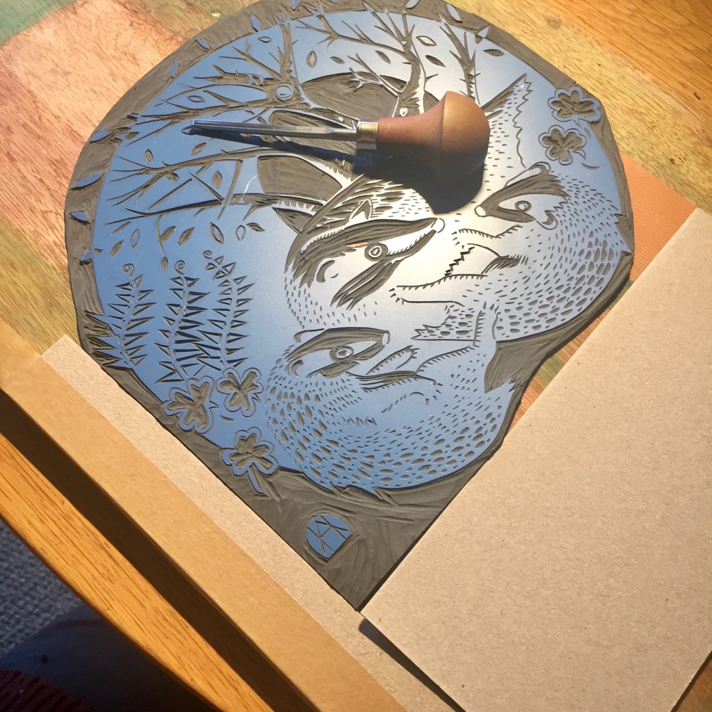 I was very happy to accept a commission for this artwork despite the rather pressing deadline of about 20 days. My brief was to create a linocut print featuring the badger and the Girl Guides trefoil. As a lover of British wildlife, particularly mammals, this was right up my street. I decided to create a 2-plate print – which is difficult to line up (register) onto each piece of paper, but gives flexibility in choosing different colour ways. I have so far created 2 prints – with mint green and grey foliage or moss-green and grey. The pictures below show the process in reverse from final print to conception. If you ever have any queries about process, do get in touch.